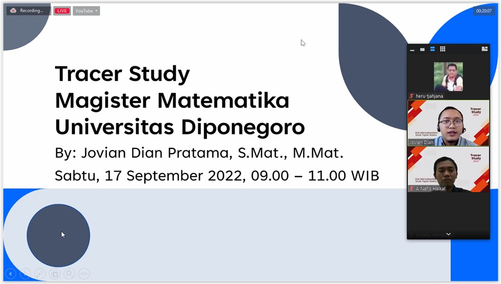 Penelusuran alumni merupakan hal yang penting. Pada Tanggal 17 September 2022 Program studi Magister Matematika kembali mengadakan tracer Study secara online. Acara dengan narasumber Jovian Dian Pratama, alumni S2 matematika, dipimpin oleh MC Nafis Haikal. Selain sharing pengalaman kuliah S2 matematika dan kiat mencari pekerjaan, pada acara ini dicatat juga aktifitas alumni setelah menyelesaikan studi S2 matematika di Undip. Acara yang dilakukan secara santai dipandu langsung oleh Ketua Prodi magister Matematika Undip Dr. R. Heru Tjahjana.