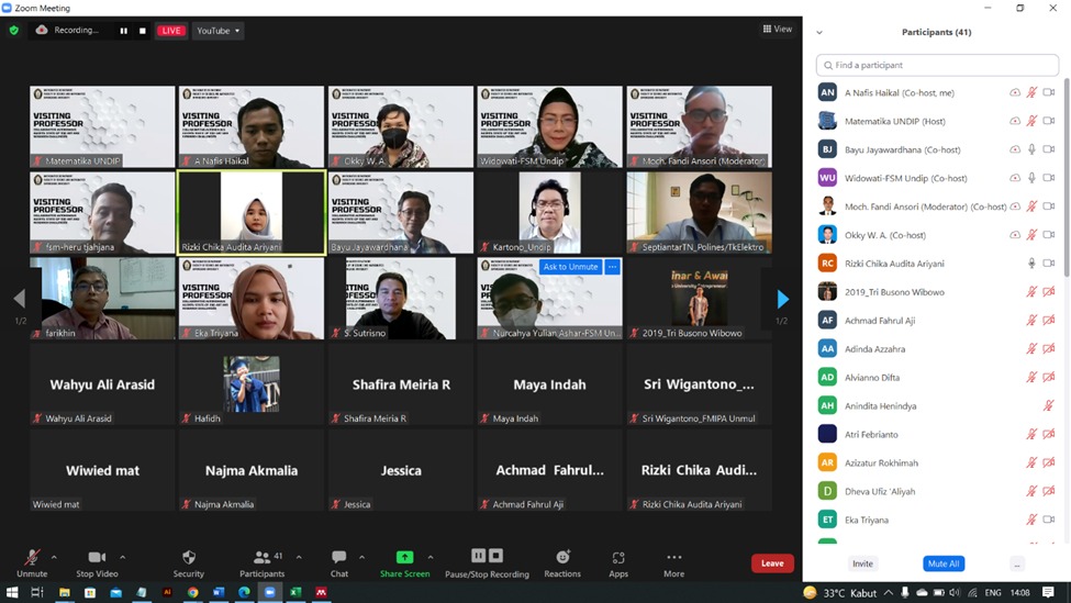 On June 20, 2022 Undip’s Master of Mathematics again held a Visiting Professor from Groningen University, the Netherlands. This event was officially opened by the Dean of the Faculty of Science and Mathematics Undip, Prof. Dr. Widowati, S.Si, M.Si. The Visiting Professor this time was led by the MC of Undip Mathematics master student Rizki Chika. The event was moderated by Dr. Mochmamad Fandi Asrori, a lecturer of Master of Mathematics Undip. The main speaker Prof. Dr. Bayu Jaya Wardana delivered material in the fields of Mechatronics, Robotics, Systems & Control Theory, Systems Biology given the title “Collaborative Autonomous Agents”. The event was closed by the Head of the Undip Master of Mathematics Study Program Dr. R. Heru Tjahjana, with the handover of certificates.